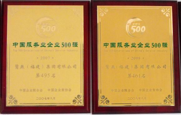 鷺燕集團又傳捷報,在榮獲了“市百強企業(yè)”、“市重點民營企業(yè)”、“湖里區(qū)十佳文明企業(yè)”之后,再次榮獲“中國服務(wù)企業(yè)500強”稱號,這已是鷺燕集團連續(xù)三年獲此殊榮。